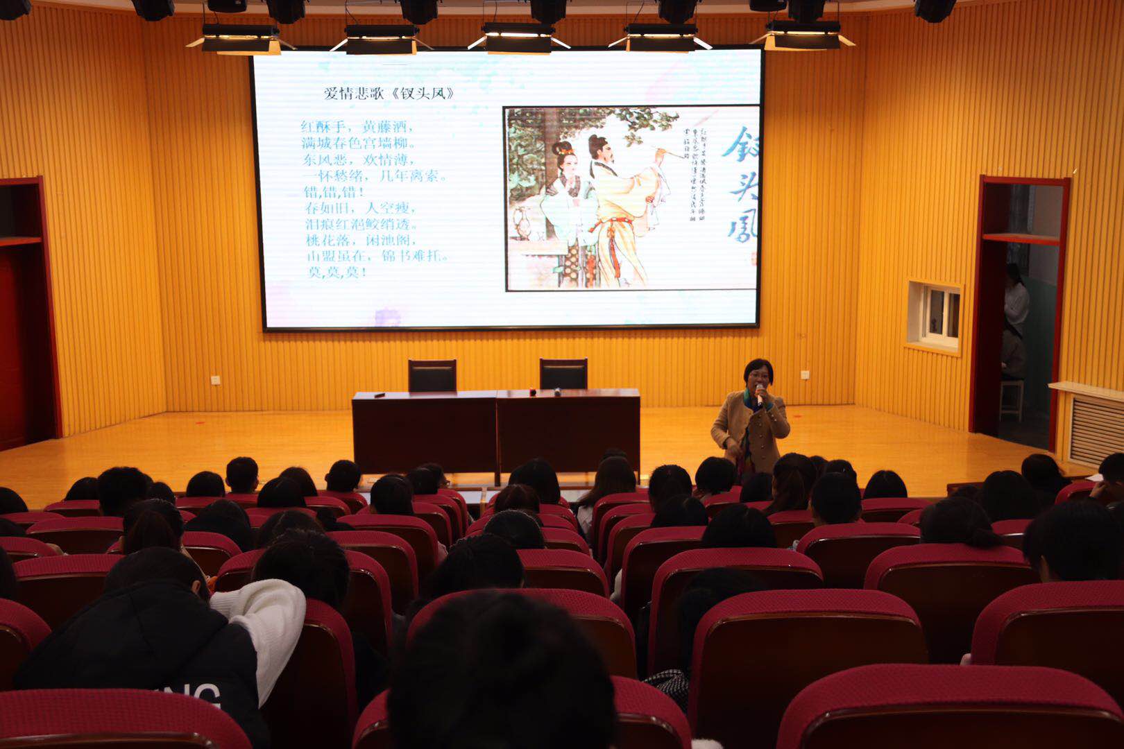 报告从朗诵与大学生共情能力培养之间的关系入手,指出共情不仅是一种态度,更是一种能力,需要设身处地的从他人的角度充分理解他人的内心,并把这种理解以关切、温暖、尊重的方式表达出来,而这种情感表达就是朗诵的神。主讲人结合大学生关注内心世界、寻求认同理解和渴望亲密关系的身心现状,总结出培养共情能力最重要的就是倾听和理解,要带着觉察去倾听,带着思考去理解,随后带领同学们欣赏了有代表性的诵读作品,指导大家朗诵时要与作品共鸣共情,要理解作品的时代背景和思想内涵,主讲人激情投入地将《钗头凤》中的爱情悲歌、《致橡树》中的女性意识、《将进酒》中的怀才坚守和《春天,遂想起》中的故乡情怀通过声情并茂的朗诵完全展示给了大家,让同学们充分领略到了朗诵这门语言艺术的奇特魅力,真如春雨滋润心灵,如号角鼓舞斗志。