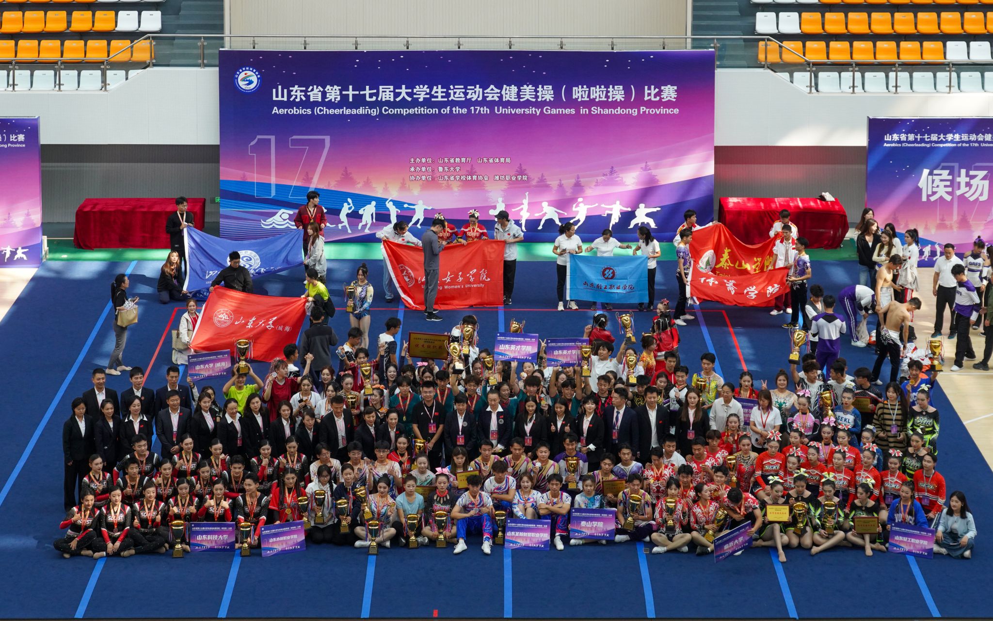 10月5日上午,2024年山东省第十七届大学生运动会健美操(啦啦操)比赛在我院滨海校区圆满落下帷幕。在为期四天的比赛中,共有来自全省高校的56支参赛队伍,近800名裁判员、教练员、运动员参加。
