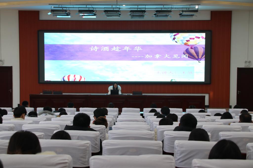 王敏老师硕士毕业于加拿大卡尔加里大学。讲座从“干净的城市”“重要的节日”“美丽的风景”三个方面,图文并茂地分享了自己在加拿大留学期间的所见、所闻、所感,带领同学们领略了加拿大的风土人情和城市风貌,感受了浓郁的异域风情。最后,王老师分享了自己海外求学期间的感受和收获,鼓励大学生“诗酒趁年华”,读万卷书行万里路,珍惜大学生活,只争朝夕,不负韶华。