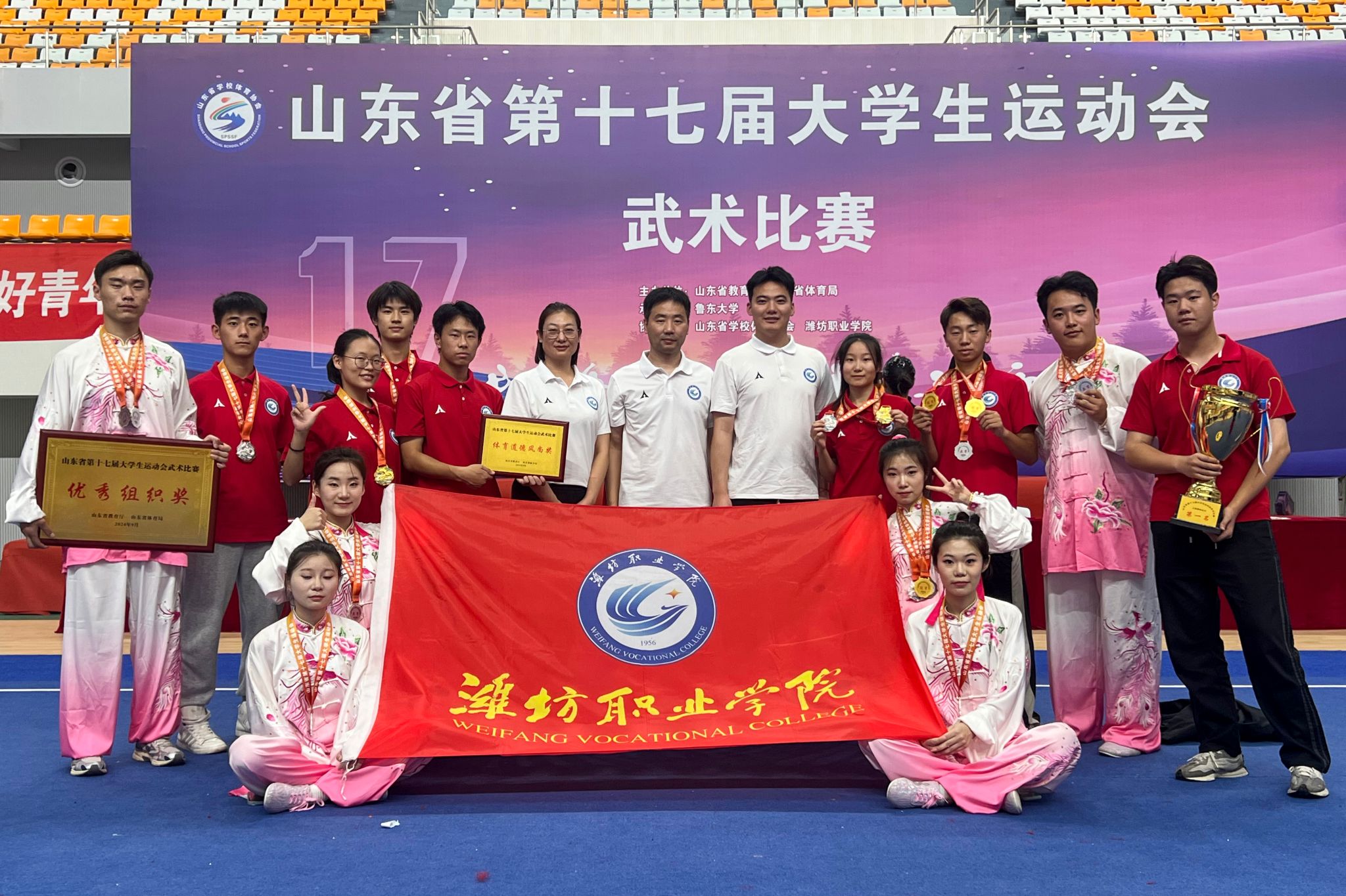 11月24日,山东省第十七届大学生运动会最后一个项目手球比赛在淄博市体育运动学校落下帷幕。我院代表队派出65名选手,先后参加了武术、健美操(啦啦操)、网球、田径、游泳、手球6项比赛,共获得12枚金牌、14枚银牌和6枚铜牌,是学院截至目前获得的最好成绩。学院获评山东省大学生运动会优秀组织奖和体育道德风尚奖。